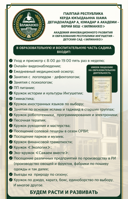 ЛИЦЕНЗИЯ № ЛО35-01230-06|00186131 от 22.10.2020 г. выданная Министерством образования и науки Республики Ингушетия от 22.10.2020 г.